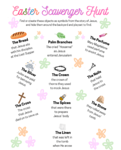 Easter activities for kids are well-known. But, instead of a traditional egg hunt, create a scavenger hunt that tells the Easter story. Hide small items like a cross, stone, cloth, and cross to symbolize the Crucifixion & resurrection. Provide clues from scripture to guide kids through the story as they search for each item.