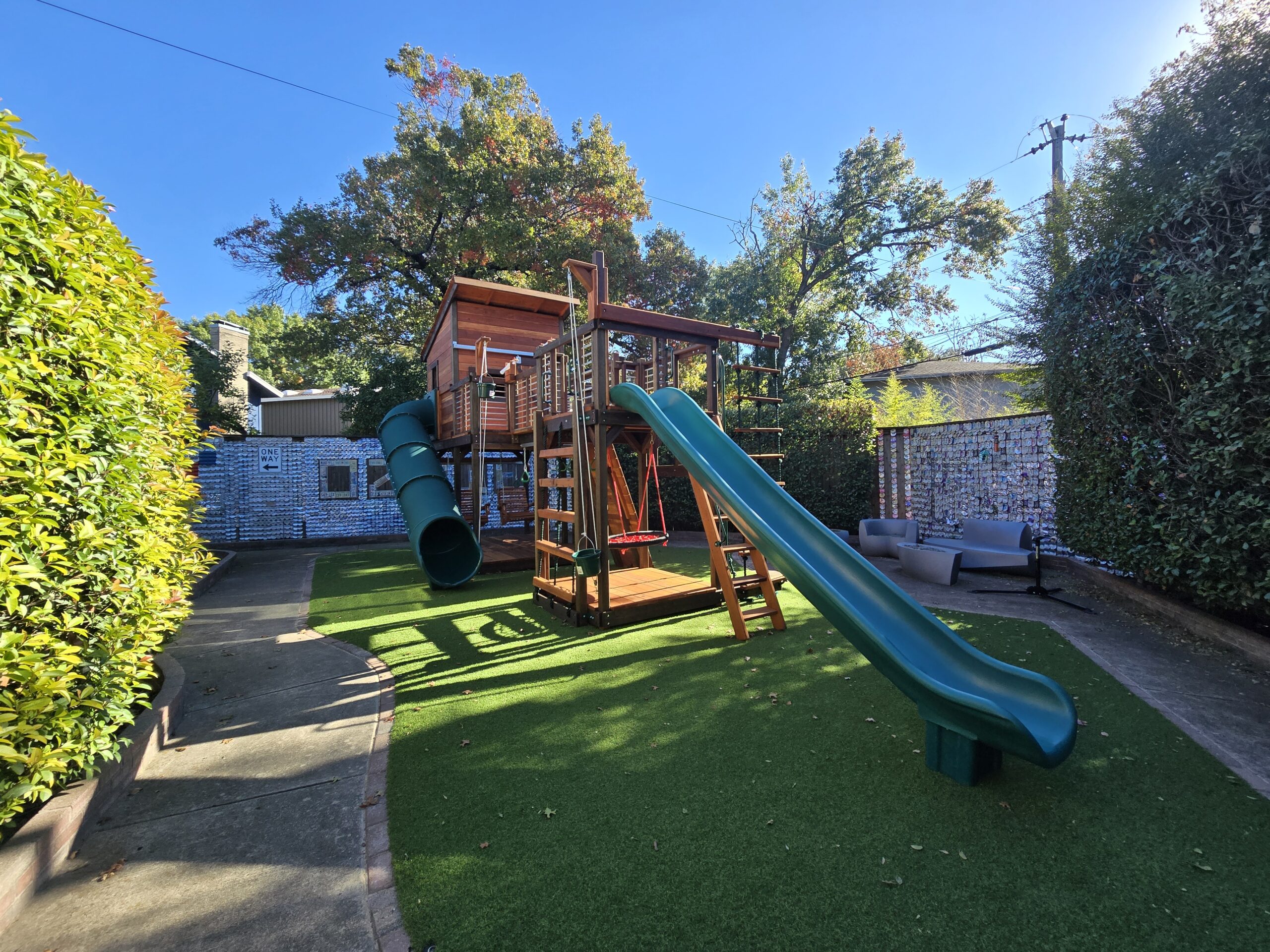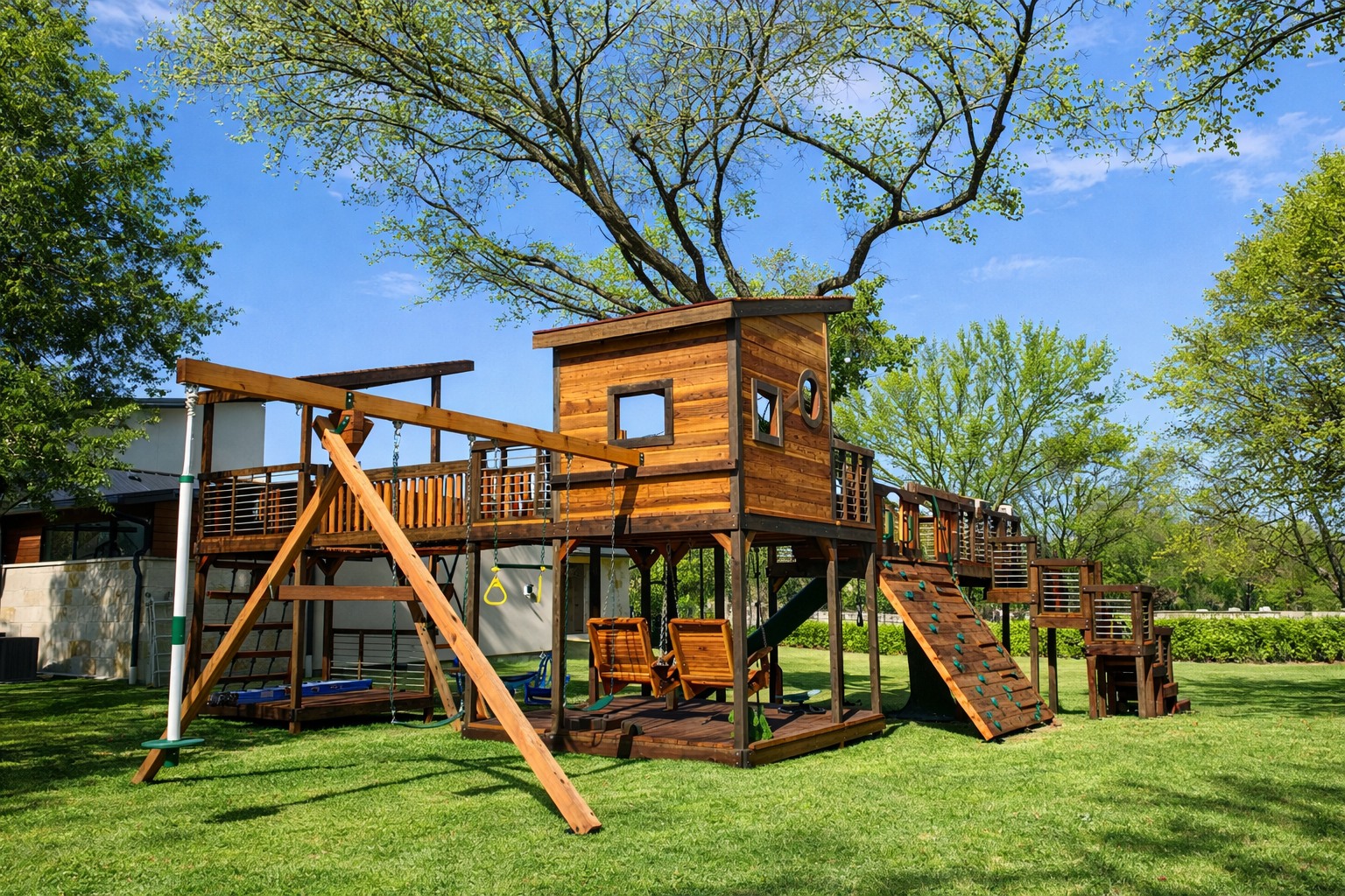 Unique features like the sliding door and railing on the upper decks demonstrate a contemporary design with linear elements on this backyard swing set.