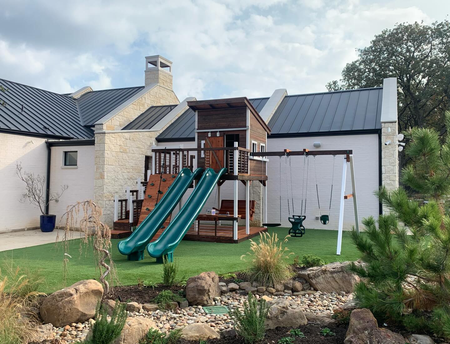Our 7’x7′ Modern Design playset offers a stylish, smart new look that is complimentary to your home and the architectural features of your landscape. The roomy, upper level is one foot taller inside the cabin, giving more head room for your family. You can choose between a combination of stain and paint colors to accentuate the features of your play structure.